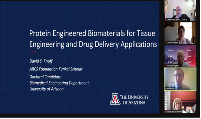 The ARCS Kunkel scholar, David Knoff, spoke to us about his research in developing novel protein-based biomaterials for advanced drug delivery and tissue engineering applications specifically for cardiovascular disease. He also told us about his experience with Tech Launch. David is looking forward to going into industry as a consultant.
